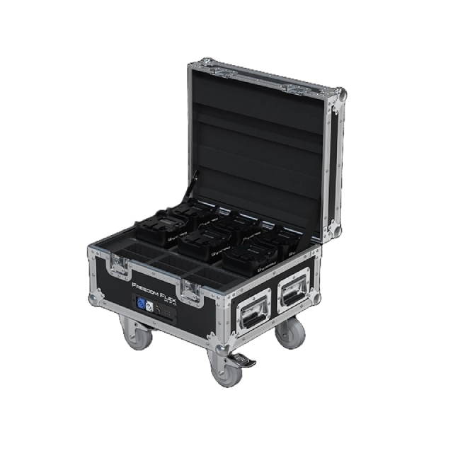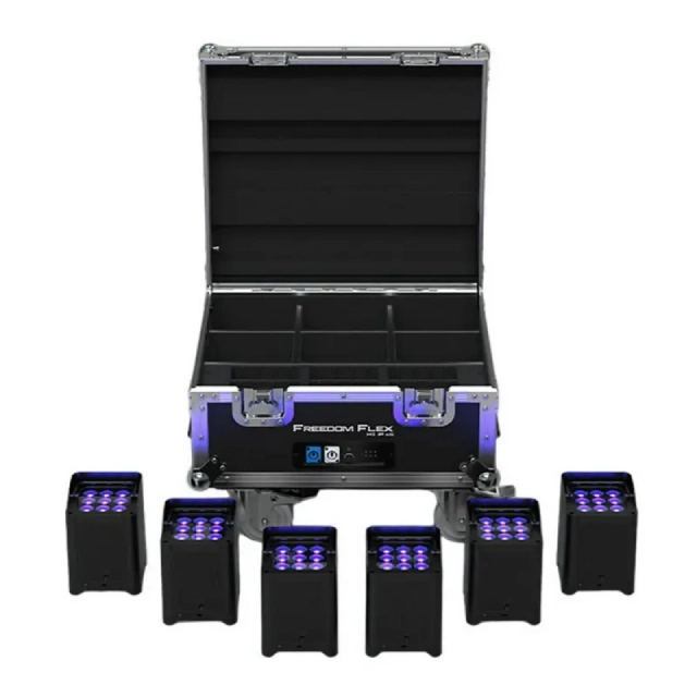 Experience unbridled and unlimited color mixing capabilities with Freedom Flex H9 IP X6, a complete lighting package including six 100% TRUE wireless, battery-operated, hex-colored (RGBAW+UV) lights in a charging road case that simultaneously charges up to six swappable batteries that ensure the fixtures are always ready to go. A Built-in RF receiver for wireless control using the included RFC or optional RFC-XL remotes and new secondary optics provide perfect color blending with nearly no artifacts. Freedom Flex H9 IP fixtures are ready indoors or out with robust housing that repels the elements for temporary outdoor situations. The lights feature full text OLED displays for easy navigation and adjustable run times ensure the fixtures last as long as your events do.